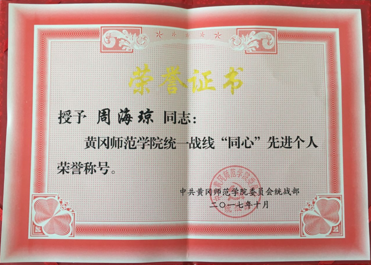 10月13日,威廉希尔WilliamHill官方网站教师周海琼副教授被授予“威廉希尔WilliamHill官方网站统一战线‘同心’先进个人”荣誉称号。