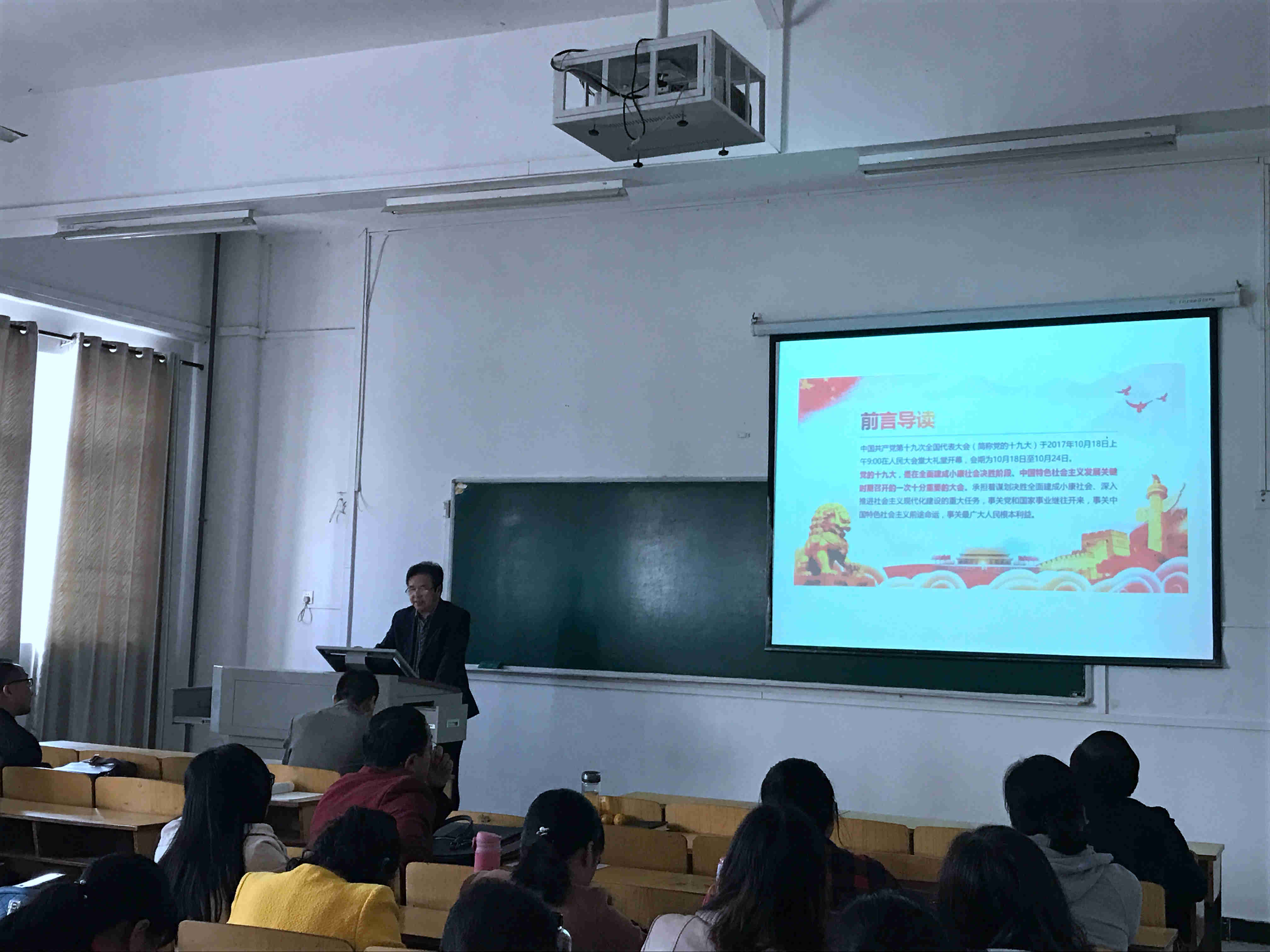 李书记从“党的十九次全国代表大会简介及重要意义、从十八届一中全会到七中全会回顾、十九大报告内容精解和做合格党员,不忘初心,永远跟党走”等四个方面为全体教职工大会详细地讲解了十九大报告的精神内涵。