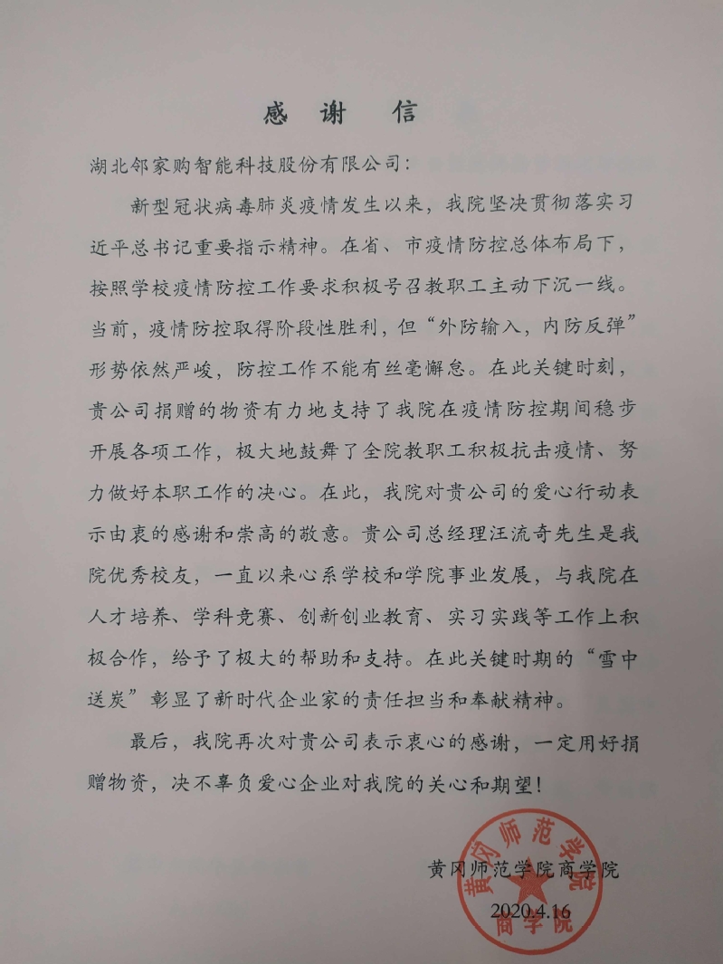 当前,疫情防控虽取得阶段性成果,但在外防输入、内防反弹的形势下防控工作还不能有丝毫放松。威廉希尔WilliamHill官方网站毕业校友——湖北邻家购智能科技股份有限公司总经理汪流奇心系母校防疫工作,4月16日下午,专程自己开货车将捐赠的50箱矿泉水送到学校,院长刘汉成代表学院接收捐赠,并向邻家购公司对威廉希尔WilliamHill官方网站疫情防控工作的支持表示衷心感谢。后期,我们将科学用好此批捐赠物资。