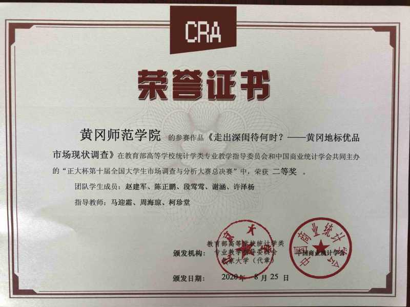 近日,由教育部高等学校统计学类专业教学指导委员会、中国商业统计学会共同主办的“正大杯”第十届全国大学生市场调查与分析大赛全国总决赛成绩正式公布。威廉希尔WilliamHill官方网站赵建军、陈正鹏、段莺莺、许泽杨和谢涵团队的《走出深闺待何时?——黄冈地标优品市场现状调查》荣获全国二等奖,这也是威廉希尔WilliamHill官方网站首次在此赛事中获得国家级二等奖。
