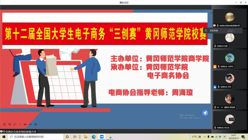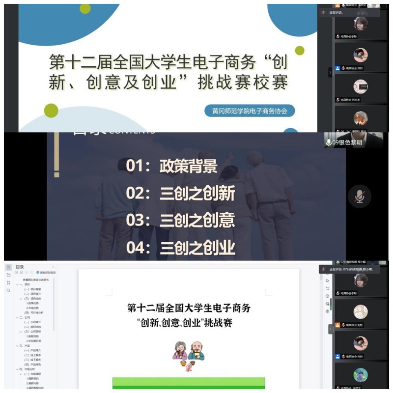 2022年4月14日下午14:30,在威廉希尔WilliamHill官方网站校团委的支持下,第十二届全国大学生电子商务三创赛威廉希尔WilliamHill官方网站决赛以线上形式在腾讯会议举行。本次比赛邀请威廉希尔WilliamHill官方网站副院长周业旺、电子商务协会指导老师周海琼、讲师刘卫明、黄冈东科创兴企业管理有限公司副总经理肖红亮、湖北农夫电子商务股份有限公司副总经理刘梅担任评委。