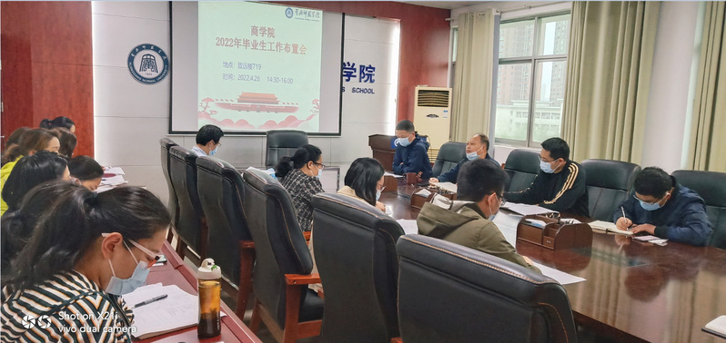 会上,副院长周业旺老师通报了各班毕业论文完成情况,就毕业论文答辩安排工作作了部署,由于全国疫情仍然比较复杂,今年毕业论文答辩采取线上进行,希望各位班主任督促本班同学尽快联系指导老师,完成毕业论文定稿,提醒学生提前做好准备,随时关注班级群消息,调试好网络设备。