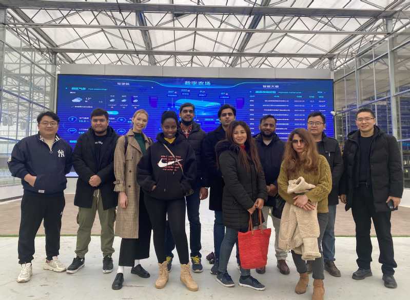 进入温室,温润的空气扑面而来,外籍师生们仔细查看电子显示屏上展示的温室动态数据,认真查看棚内各类水果、蔬菜的长势,与示范园工作人员交流有关大棚建设投资、智能网络设备运行、农作物生产等方面的问题。管理人员向外籍师生详细介绍了大棚内的智慧物联网装置,棚内装有多个传感器,配有卷帘控制柜、智能水肥一体机、植物补光灯等智能化设施,可根据作物特性和季节设置相应参数,实现自动或手动控制大棚内的温度、湿度、光照度等,使农作物始终处在最佳生长环境中。