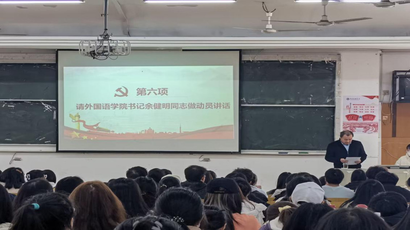 随后,外国语学院党委书记余健明同志做动员讲话。首先对本期入党积极分子培训班的学员表示欢迎和祝贺,其次从三个方面对本次培训班进行简要讲述:一是要端正态度,正确认识参加入党积极分子培训班的重要意义;二是做到组织上入党,思想上入党;三是认真学习二十大精神以及习近平新时代中国特色社会主义思想,从行动上追随党,树立正确的入党动机。最后对各位参加培训班的学员提出以下希望和要求:一是遵守纪律和要求,不迟到早退;二是强化管理,强化培训严肃性;三是努力学习,坚持学以致用。