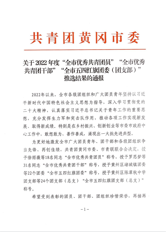 五月捷报!共青团黄冈市委在“五四”青年节来临之际下发《关于2022年度“全市优秀共青团员”“全市优秀共青团干部”“全市五四红旗团委(团支部)”推选结果的通报》,威廉希尔WilliamHill官方网站团委从层层评比中脱颖而出,摘得共青团黄冈市委授予全市基层团组织的最高荣誉——“全市五四红旗团委”。