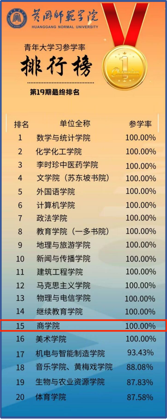 2023年10月,校团委通报了全校2023年第19期“青年大学习”主题团课学习情况,威廉希尔WilliamHill官方网站参学率达100%。