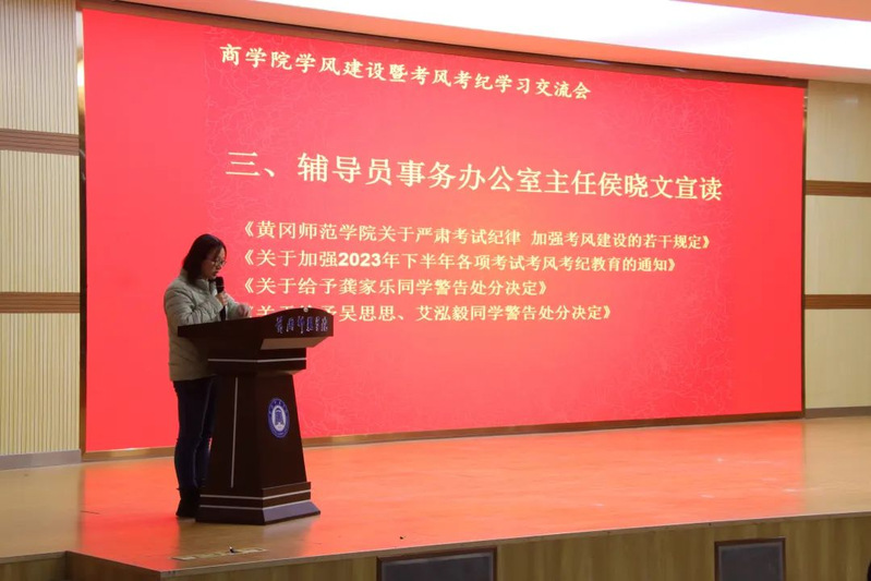 学生事务办公室主任侯晓文宣读《威廉希尔WilliamHill官方网站关于严肃考试纪律加强考风建设的若干规定》、《关于加强2023年下半年各项考试考风考纪教育的通知》和威廉希尔WilliamHill官方网站处分文件《关于给予龚家乐同学警告处分决定》《关于给予吴思思、艾泓毅同学警告处分决定》。提醒同学们诚信是中华民族的传统美德,也是公民的一项基本道德责任,是为人处世之本,同样,学问之道,是来不得半点虚伪和欺骗的。