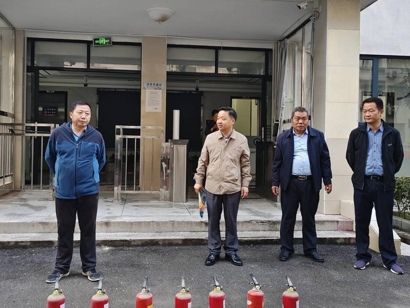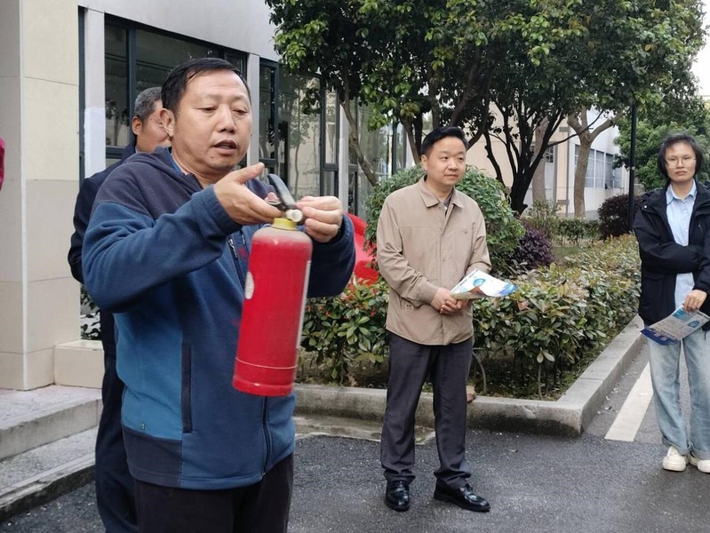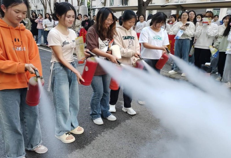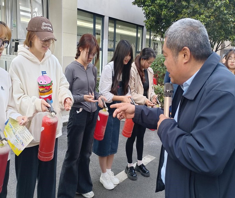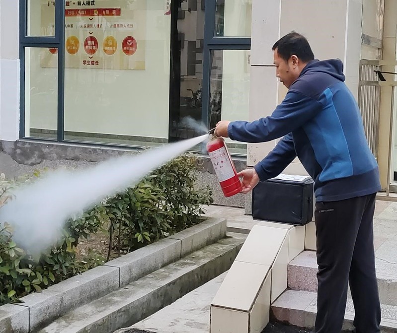 学校消防科阮征老师向同学们介绍了灭火器的使用方法,并现场给同学们演示。灭火时,可手提或肩扛灭火器快速奔赴火场,在距燃烧处5米左右,放下灭火器。如在室外,应选择在上风方向喷射。使用的干粉灭火器若是外挂式储压式的,操作者应一手紧握喷枪、另一手提起储气瓶上的开启提环。