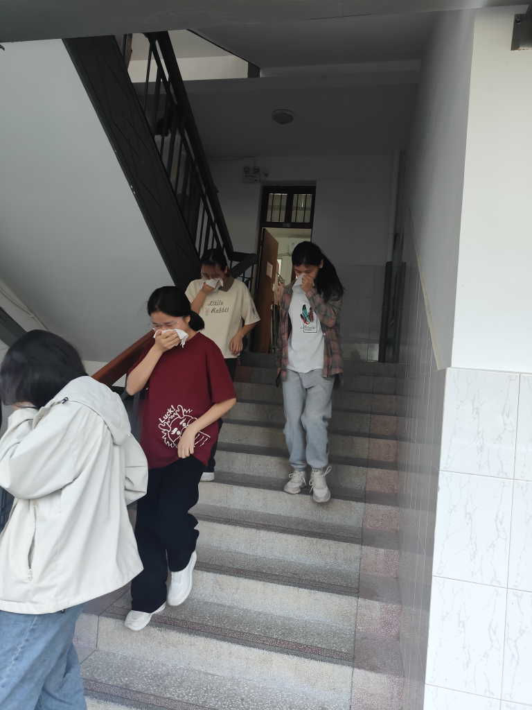 本次演练通过烟雾弹模拟火灾环境,让同学们亲身感受火灾场景。随着三次哨声吹响,在浓烟四起中开始。面对突发警报、浓烟滚滚,同学们也没有惊慌失措,而是有条不紊地用湿毛巾捂着鼻子、躬着身子依次离开寝室,排成一列纵队,在学生会干部的指挥下,按照指定逃生路线迅速地从宿舍撤离到了安全的空旷场地。全体同学沉重冷静、互相合作,一切行动听从指挥,在演练过程中做到了不慌乱、不拥挤。
