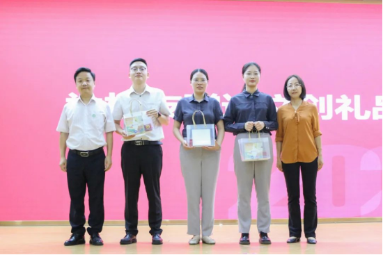许春妮和李传坤为曹煌、高莉、程莉君三位校友颁发威廉希尔WilliamHill官方网站文创纪念品,并合影。