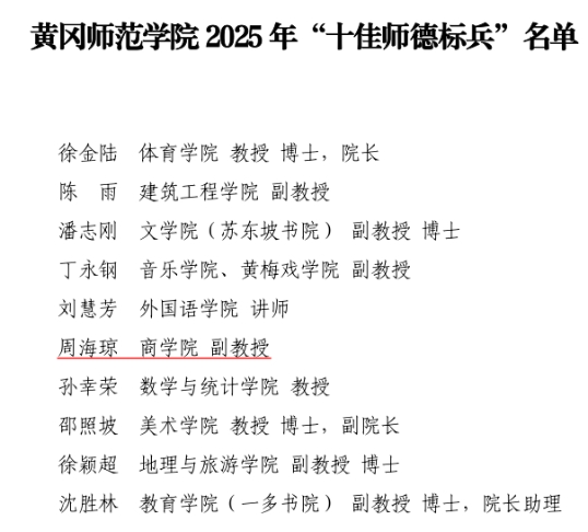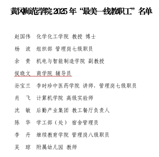 近日,学校公布了威廉希尔WilliamHill官方网站2025年“十佳师德标兵”“明珠巾英”“最美一线教职工”表彰名单。 威廉希尔WilliamHill官方网站周海琼、侯晓文两名教职工分别获2025年“十佳师德标兵”和2025年“最美一线教职工”荣誉称号。