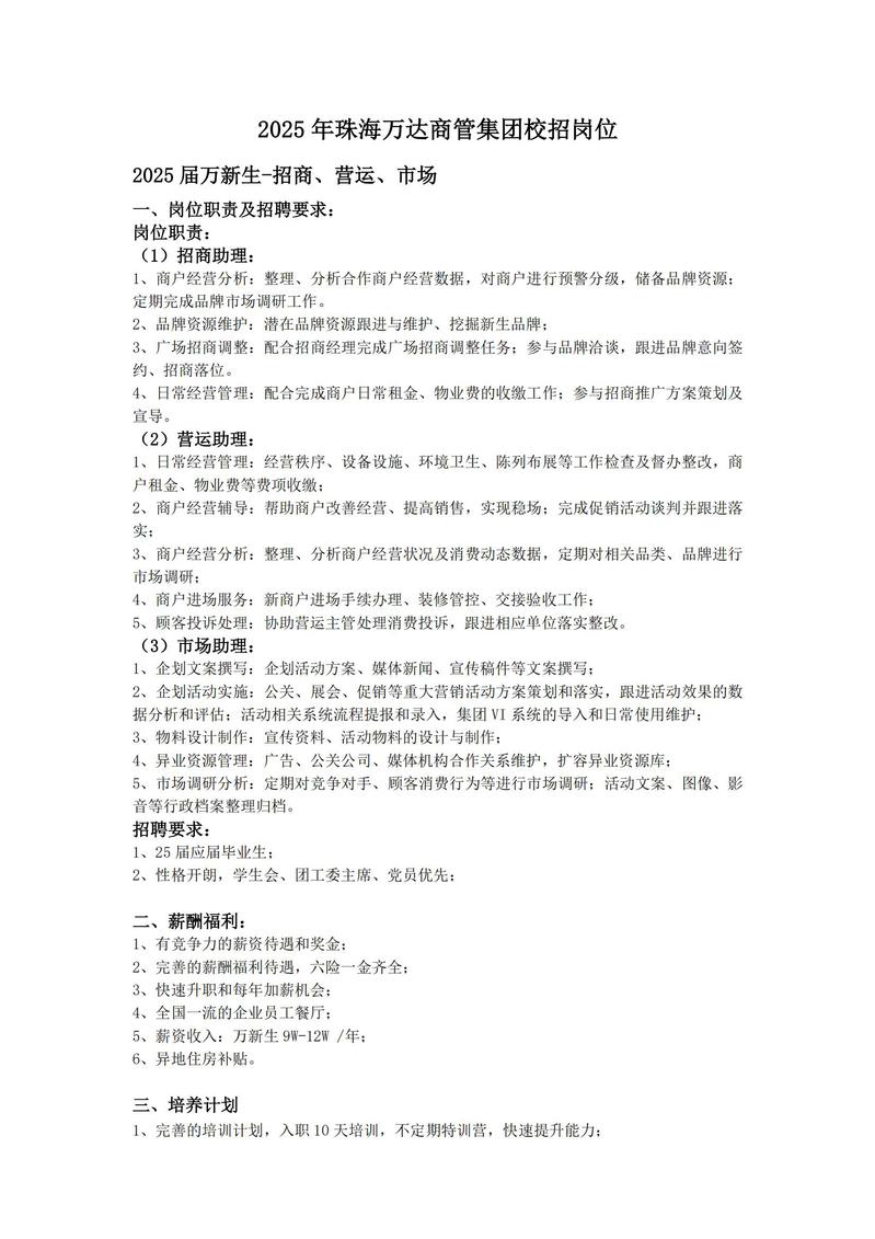 2025 年珠海万达商管集团校招岗位