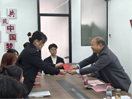 院党委书记袁建明同志为新发展党员代表颁发《中国共产党章程》。