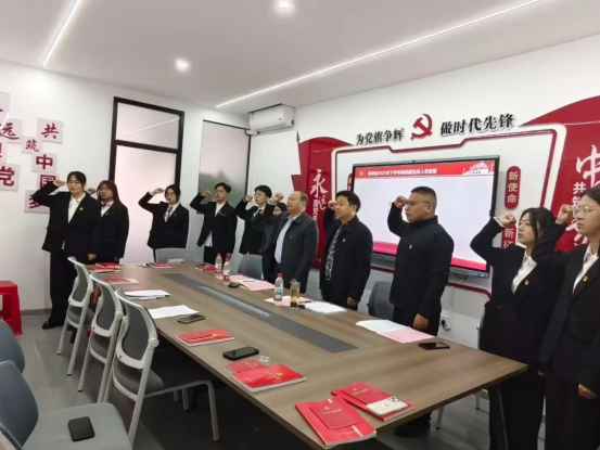 在集体宣誓环节,新发展党员同志们面向党旗,举起右手,在领誓人的带领下庄严宣誓,铿锵有力的誓言在活动室里回荡,表达了他们对党的忠诚和为共产主义事业奋斗终身的决心。