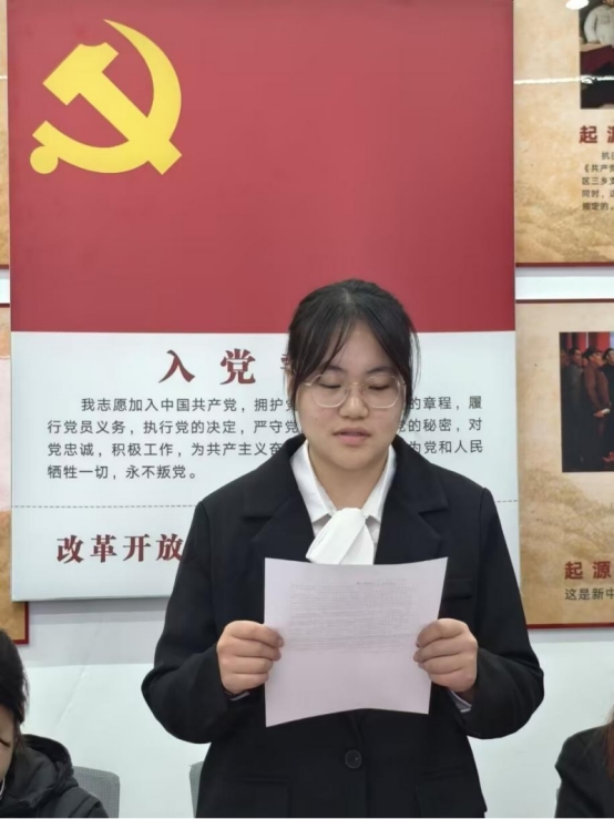新发展党员代表程文慧同志代表全体新发展党员向党组织一直以来的的关怀与培养表示感谢。她表示,站在新的起点,面对党旗许下铮铮誓言,这不仅是一份使命的传承,更是一份沉甸甸的责任,作为新发展党员,定当珍惜这份政治荣誉,恪守入党誓言,将今天的激动与自豪,转化为在未来学习、工作和生活中的奋斗动力,以实际行动发挥党员先锋模范作用,努力践行对党的忠诚,为党的事业贡献青春力量。
