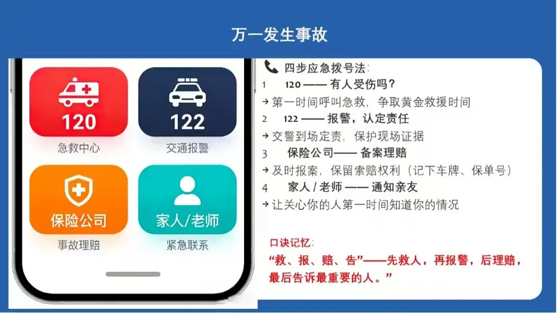 同时,她也提醒到,若不幸遭遇交通事故,请务必记住“救、报、赔、告”的应急口诀:先拨120抢救伤者,再打122报警定责,接着联系保险公司备案理赔,最后告知家人和老师。这组简单的步骤,能在危急时刻帮我们守住最关键的安全底线。