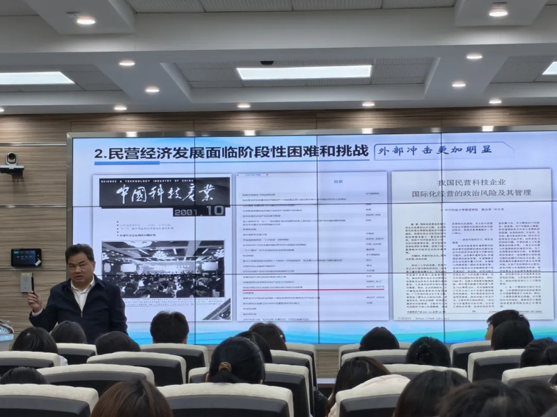 课前,陈向军书记向同学们展示了自己精心准备的教材、教案、课件和讲稿,勉励大家上课要认真听讲、勤于记录、深入思考,真正做到学有所获、学以致用。随后,他从“我国经济应对外部冲击的能力与底气来源”“为何要促进民营经济发展壮大”“我国做强国内大循环的实现方式”三个方面全面剖析了当前中国经济的热点问题,深入阐释了其核心逻辑、现实意义与实践路径。通过系统讲解,引导学生深刻认识到,准确把握经济发展态势是当代青年立足时代、成长成才的重要前提,更是主动融入国家发展大局的根本支撑。