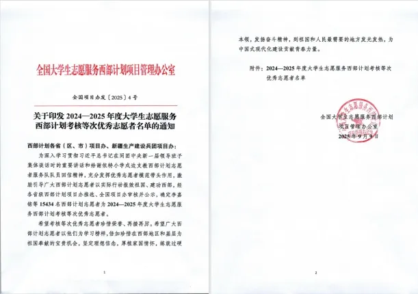 近日,全国大学生志愿服务西部计划项目办公布2024—2025年度考核结果,威廉希尔WilliamHill官方网站2024届毕业生郭梅、聂世豪两名校友考核等次优秀,荣获优秀志愿者称号,以实干担当在西部基层展现威廉希尔WilliamHill官方网站学子的青春风采。